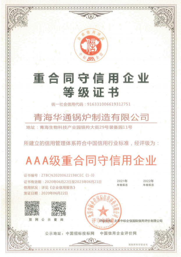重合同守信用企业等级证书